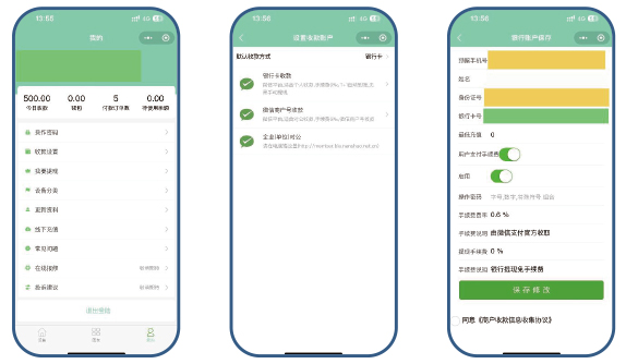 3. 根据流程提示进入 银行卡收款→ 添加→ 填写银行卡预留手机号,对应银行卡姓名,身份证号,卡号,记得一定要把启用打开,请勿关闭,然后点击保存修改即可。