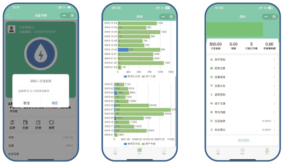 7. 进入“我的”界面,可修改账户密码、收款信息、设置“起充”金额,更换管理员手机号、线下充值界面;也可切换到租客版。
